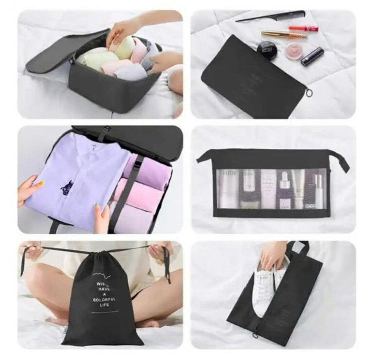 شامل ۳ عدد کیسه نگهدارنده لباس با رویه توری شفاف، ۱ کیسه بنددار، ۱ کیف مخصوص لباس زیر، ۱ کیف تخت، ۱ کیف کفش و ۱ کیف لوازم بهداشتی است.
