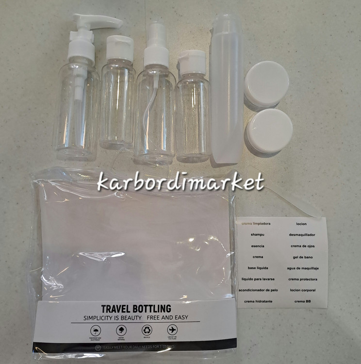 شامل ۷ عدد ظرف در دار مناسب برای انواع کرم ولوسیون و سرم وشامپو و..و یک عدد کاردک